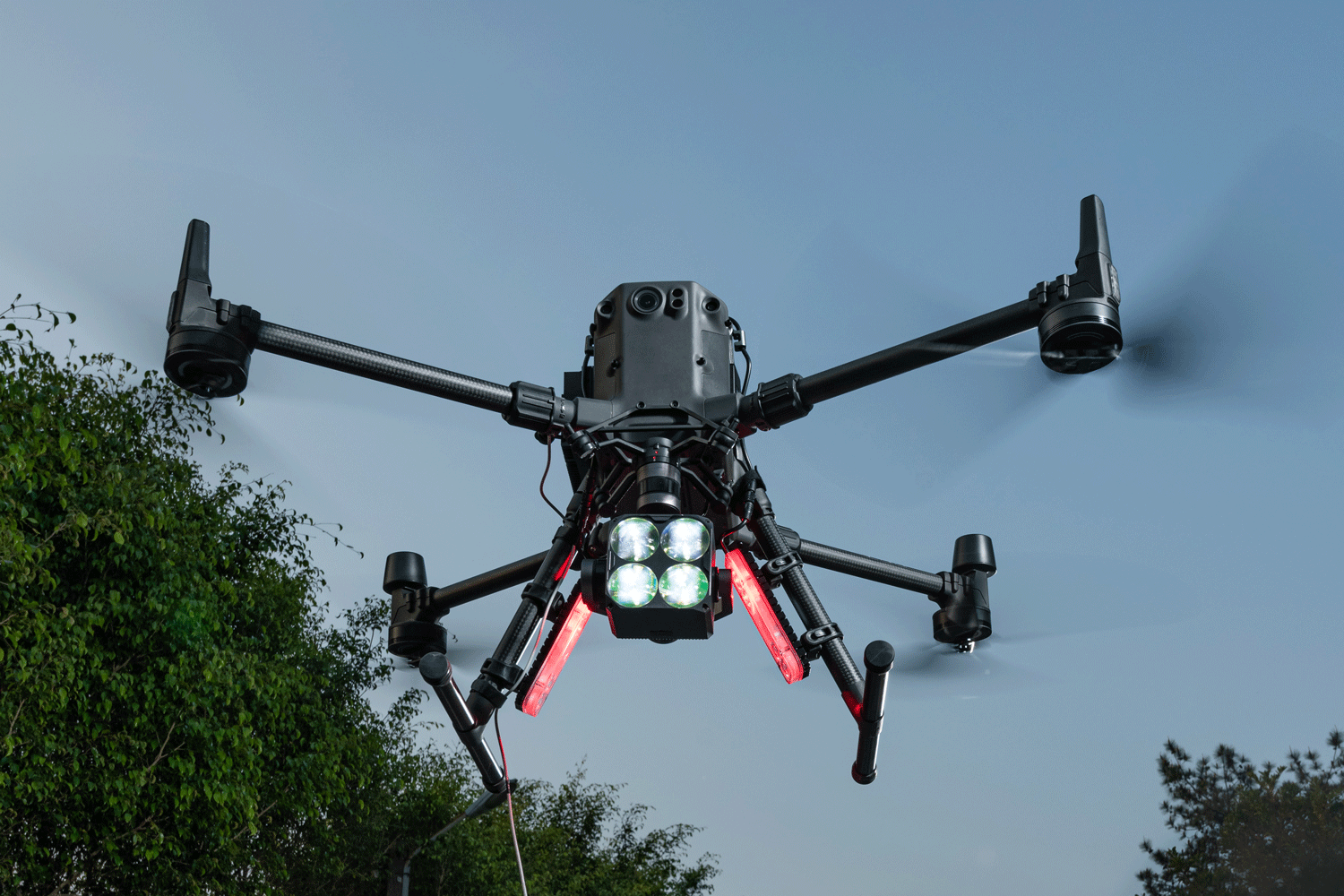 成至 GL60 Plus 云臺(tái)燈,采用 4 組光學(xué)成像組件,每組由 4 片透鏡組合而成,發(fā)射出僅 15 度角的銳利光柱,顏色一致,亮度均勻,在 120w 時(shí),100m 的光斑中心照度值達(dá) 24lux;在 150m 的照射高度下,有效照射面積達(dá) 1225 平方米,將無(wú)人機(jī)夜間作業(yè)的空中照射效果,提升至新的高度。整體采用輕量設(shè)計(jì),僅重 750 克,額定功率達(dá) 120W ,通過(guò) DJI SkyPort V2.0 接口,兼容大疆經(jīng)緯 M300 RTK 等系列無(wú)人機(jī),可滿足夜晚巡查、警告驅(qū)離、方位指示、電力巡線、搜索救援等夜間作業(yè)需求。